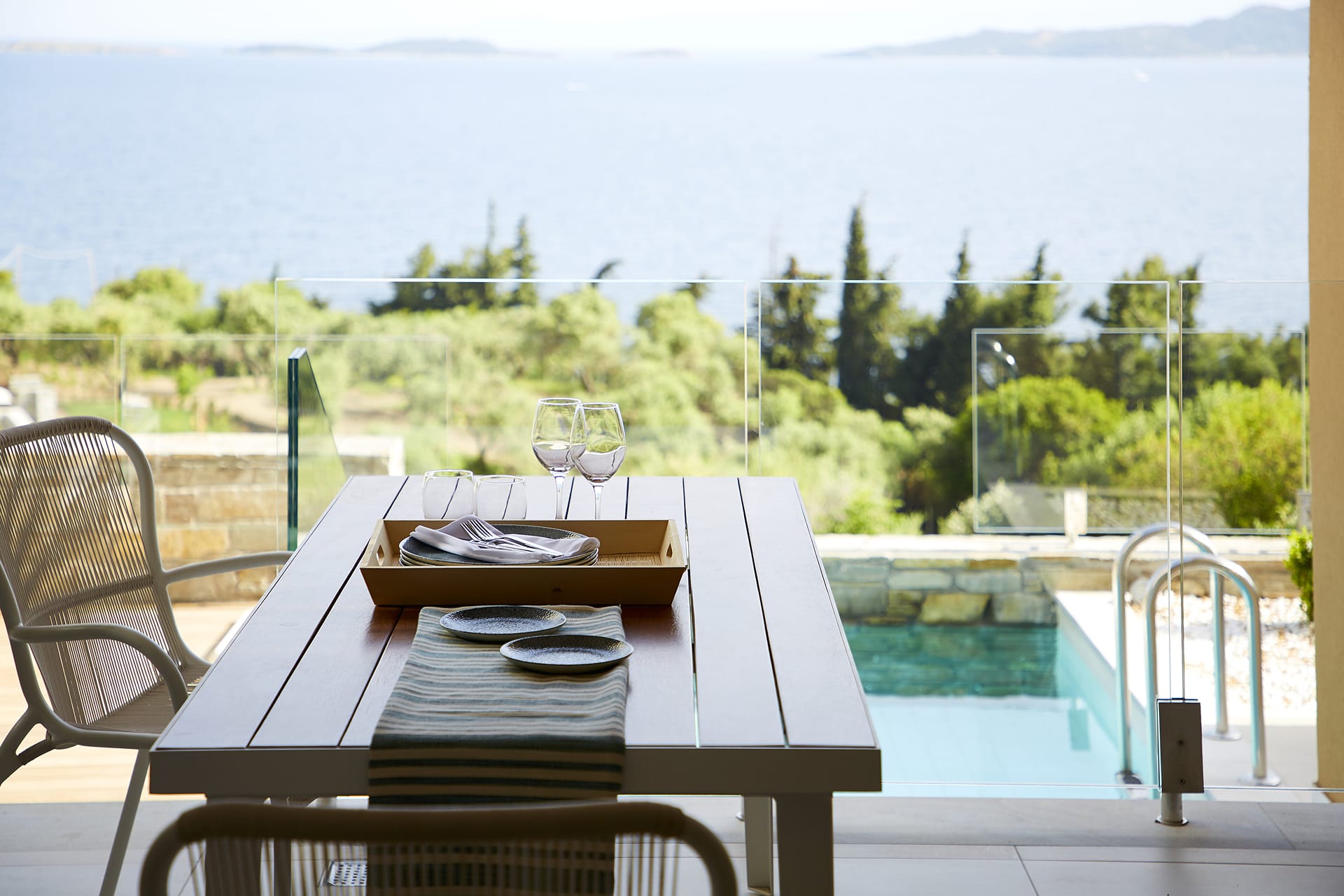 The Residential Two-Bedroom Pool Villa – separated into two different levels – is spacious and stylish, with modern furnishings in its bedrooms and in the cosy living space. Step outside and laze away in the hammock, cool off in the splash pool and breathe in the calm surroundings of Halkidiki and the tranquil view of the gulf of Athos.